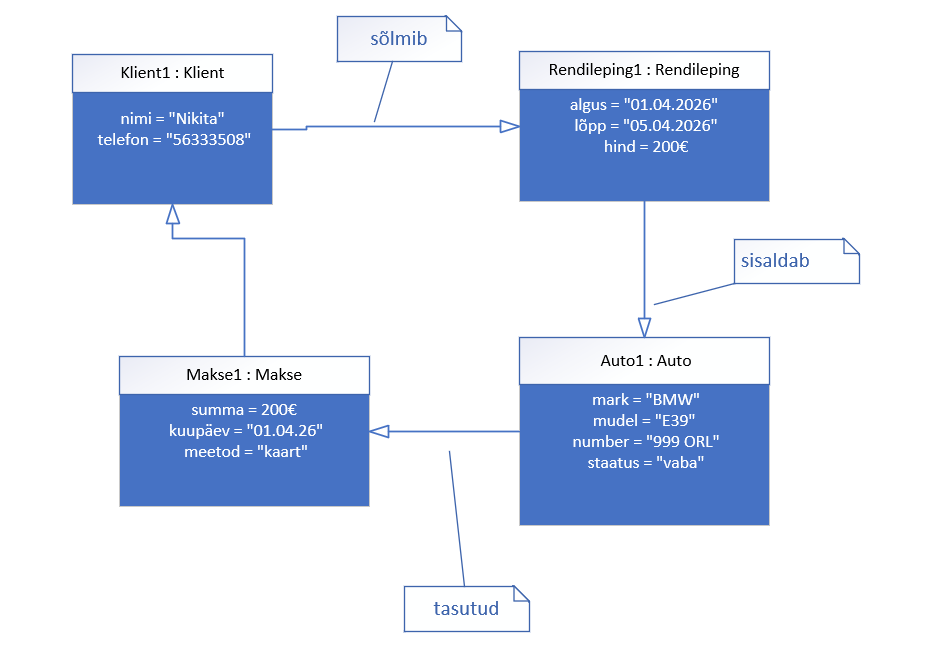 Klient1 : Klient). - Atribuudid — objektide andmed (nimi, kuupäev, hind jne).